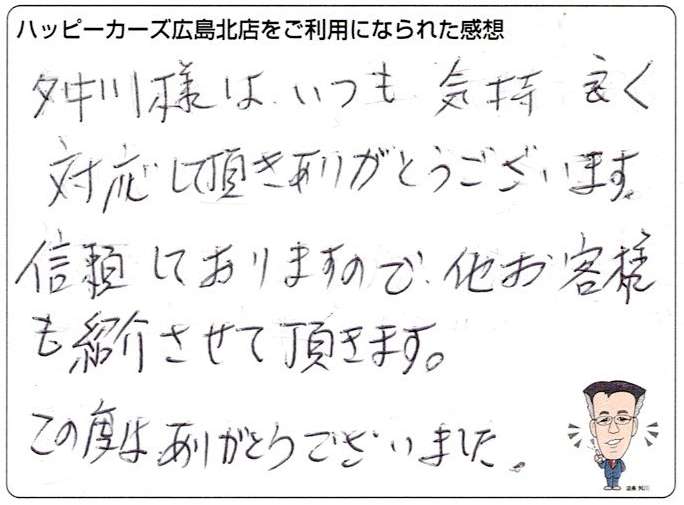 スズキ スペーシア 2025年11月25日 最終更新日時 : 2025年11月25日 admin_71332101 お客様の声 舛川さまはいつも気持ちよく対応して頂きありがとうございます。信頼しておりますので、他お客様も紹介させていただきます。この度はありがとうございました。 FacebookX